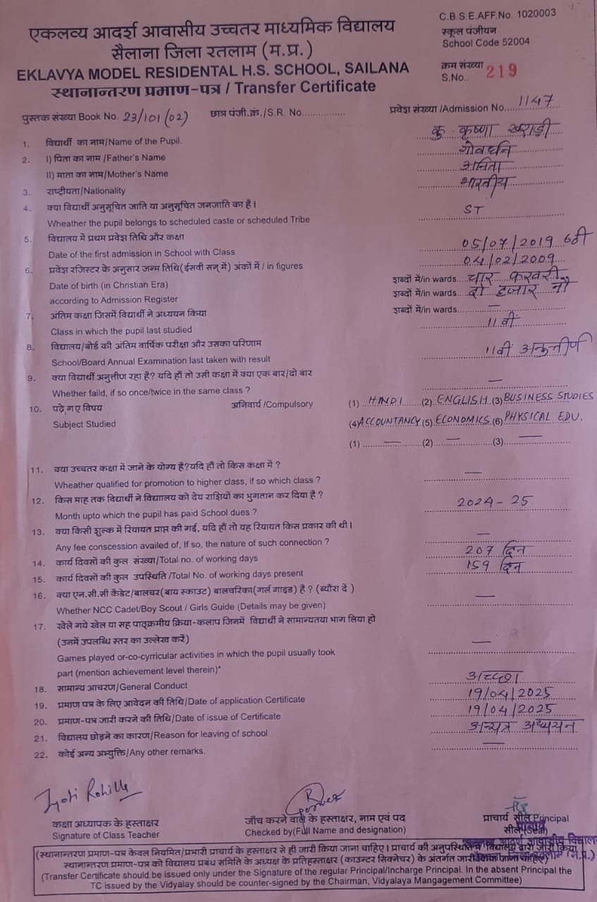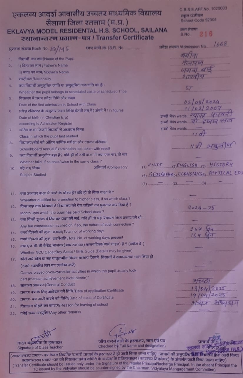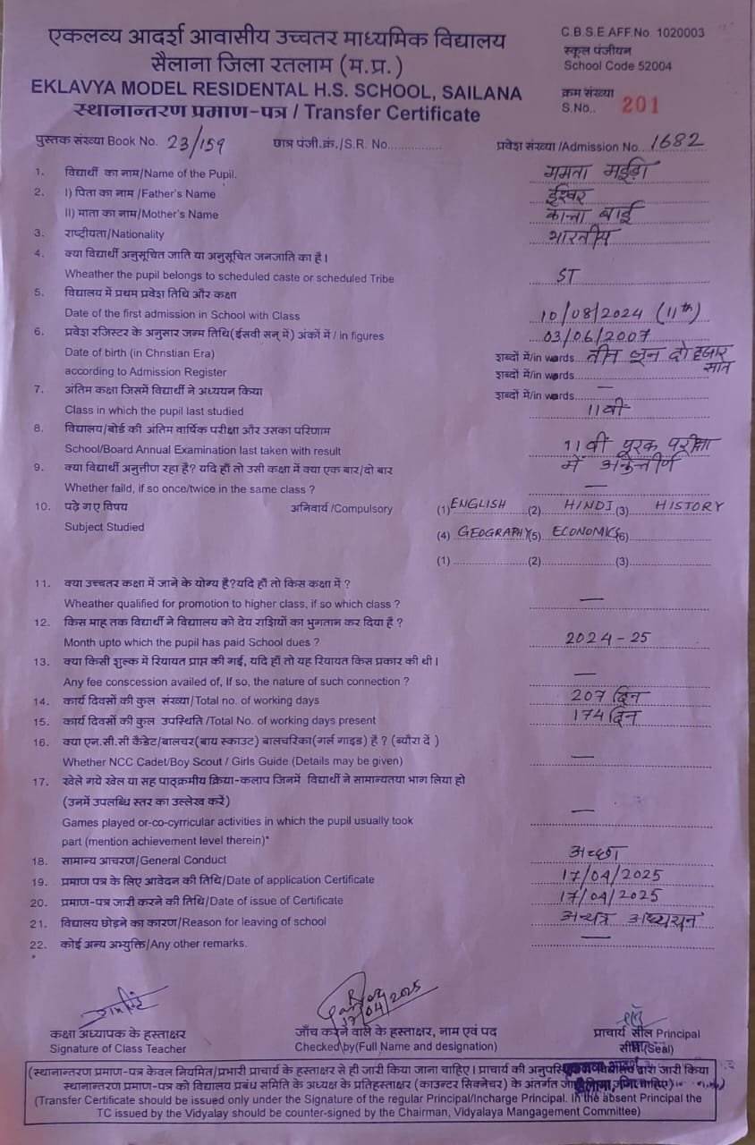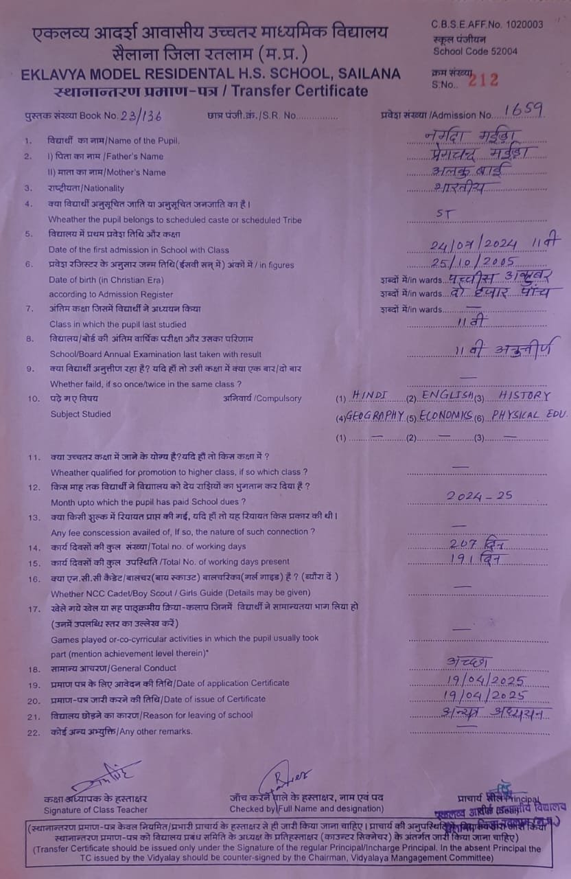 | 1659 | Narmada Maida | 19/04/2025 | 212 | 11th fail |  | | | | | | | | | | | | | | | | | | | |